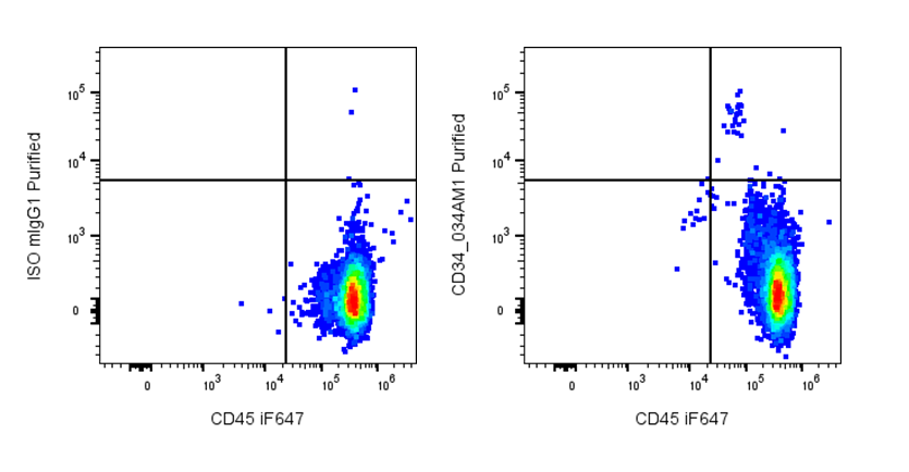 CD34 (gp105–120) is a type I monomeric sialomucin-like glycophosphoprotein with a molecular weight of 105–120 kDa, expressed on hematopoietic stem and progenitor cells, bone marrow stromal cells, capillary endothelial cells, embryonic fibroblasts, and some neural tissues. CD34 serves as a widely used stem cell marker and mediates cell adhesion and lymphocyte homing through interactions with L-selectin and E-selectin ligands. CD34 expression is dynamic and reversible, reflecting specific states of hematopoietic development, including proliferation, differentiation, and altered adhesion properties. Multiple epitopes have been identified based on differential enzymatic sensitivity. Clinically, CD34 is expressed in ~40% of acute myeloid leukemias and 65% of pre-B acute lymphoblastic leukemias, but only 1–5% of acute T-lymphoid leukemias. It is also used to assess stem cell counts for transplantation and can provide prognostic information in certain cancers.