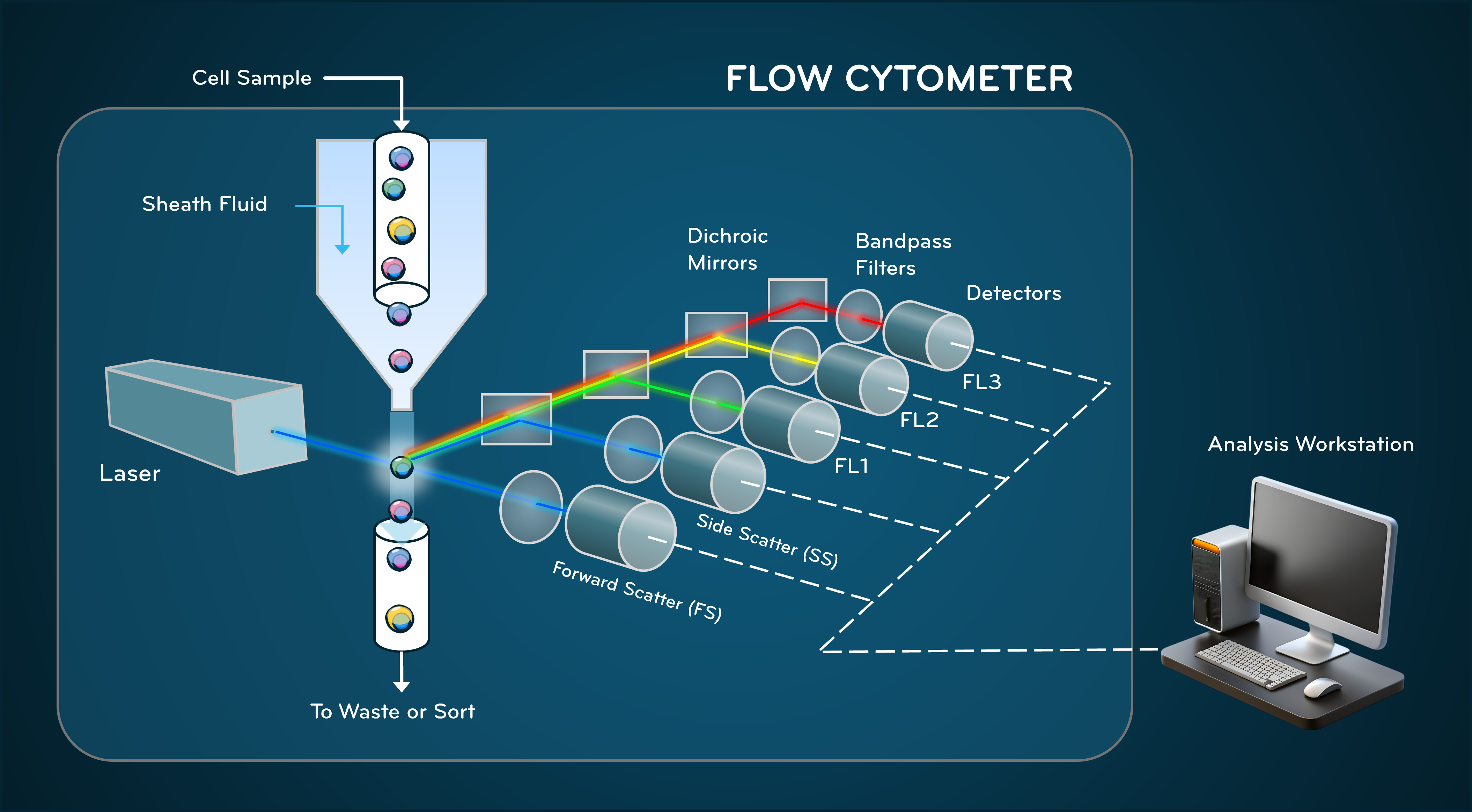 The optical system transforms biological properties into measurable light signals. One or more lasers illuminate cells at the interrogation point. When light interacts with a cell, it is scattered or absorbed and re-emitted by fluorescent molecules.