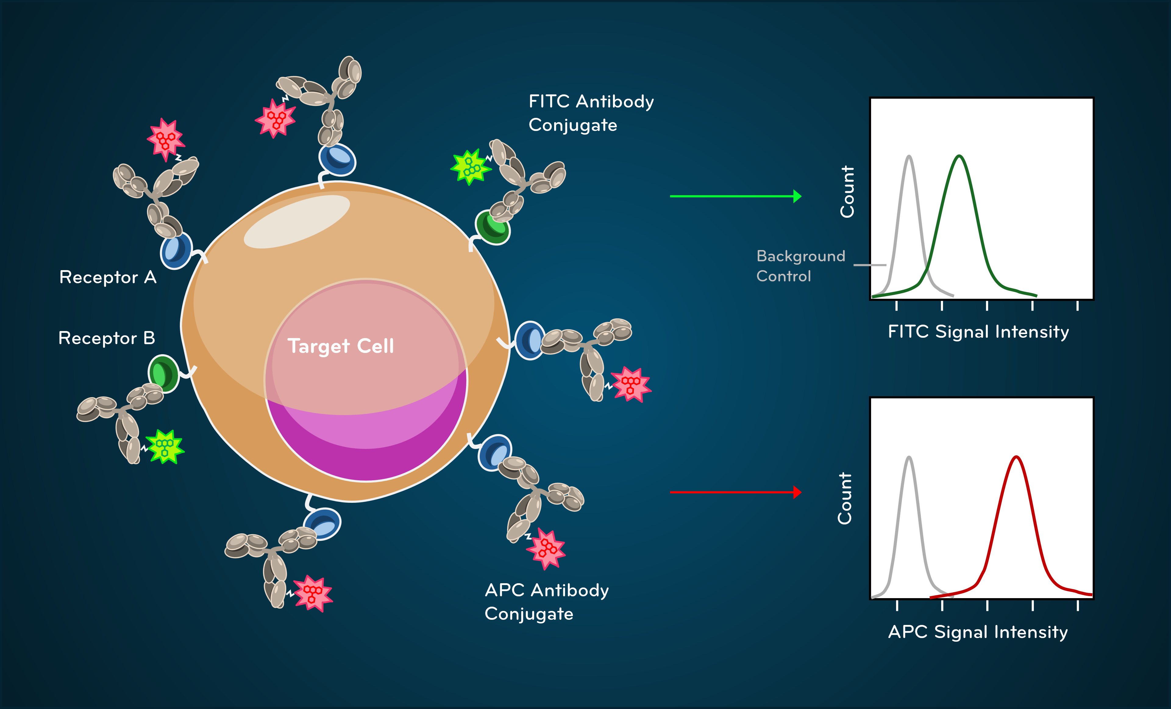Fluorophore selection is critical in multiparameter experiments. Bright fluorophores are typically assigned to low-density markers, while dimmer fluorophores are reserved for highly expressed targets. Spectral overlap must be considered to minimize signal spreading and preserve resolution.