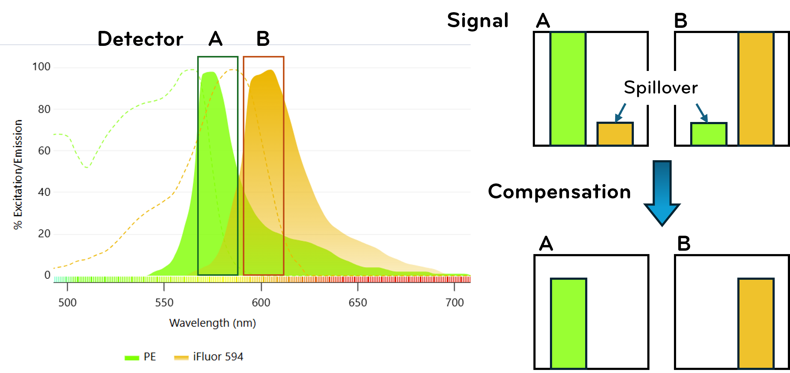 Because many fluorophores exhibit overlapping emission spectra, signal separation requires careful optical design and post-acquisition correction. The number of lasers and detectors determines the dimensionality of measurable parameters.
