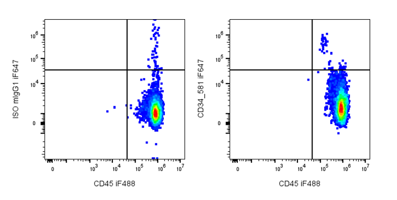 CD34 (gp105–120) is a type I monomeric sialomucin-like glycophosphoprotein with a molecular weight of 105–120 kDa, expressed on hematopoietic stem and progenitor cells, bone marrow stromal cells, capillary endothelial cells, embryonic fibroblasts, and some neural tissues. CD34 serves as a widely used stem cell marker and mediates cell adhesion and lymphocyte homing through interactions with L-selectin and E-selectin ligands. CD34 expression is dynamic and reversible, reflecting specific states of hematopoietic development, including proliferation, differentiation, and altered adhesion properties. Multiple epitopes have been identified based on differential enzymatic sensitivity. Clinically, CD34 is expressed in ~40% of acute myeloid leukemias and 65% of pre-B acute lymphoblastic leukemias, but only 1–5% of acute T-lymphoid leukemias. It is also used to assess stem cell counts for transplantation and can provide prognostic information in certain cancers.