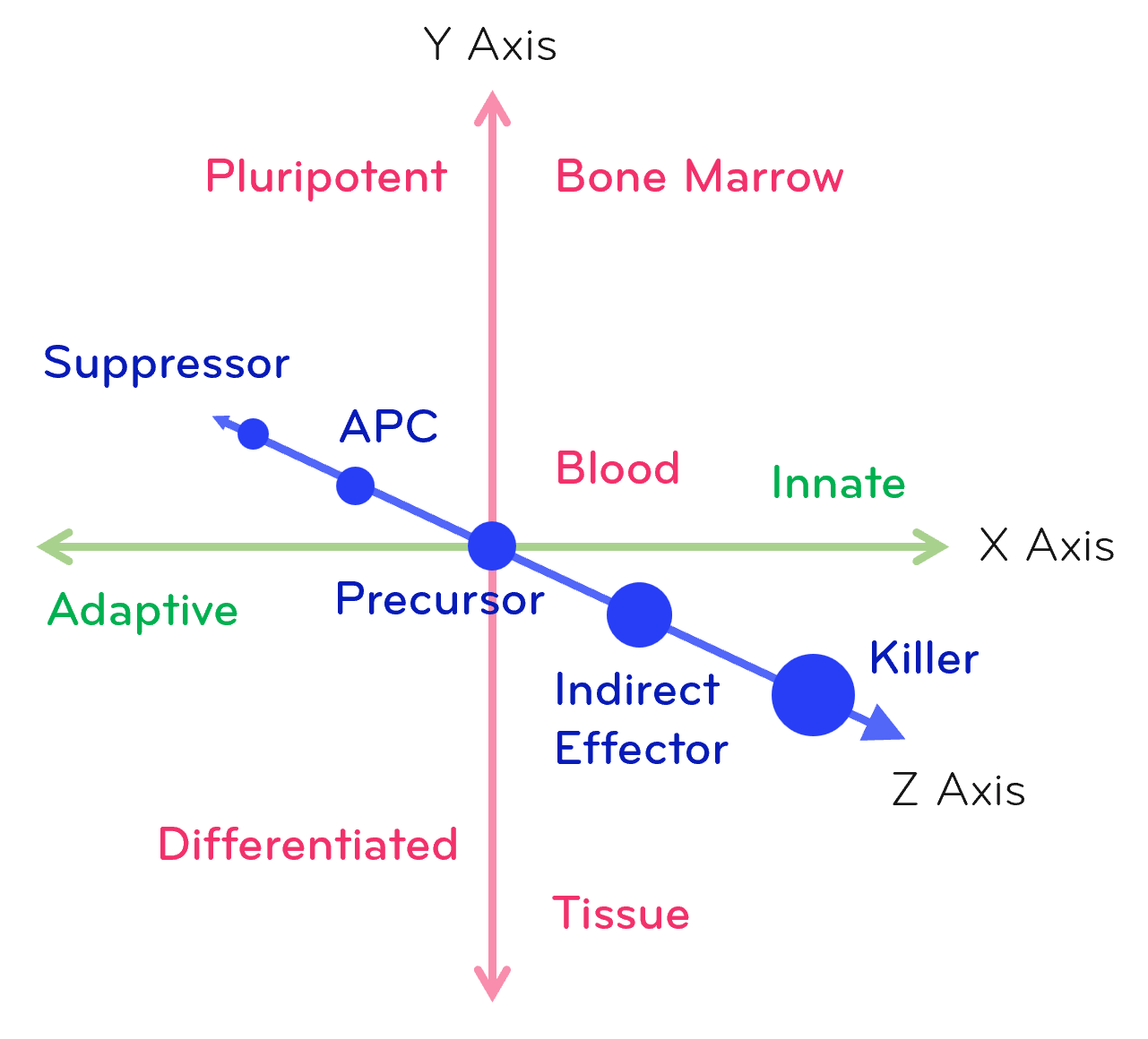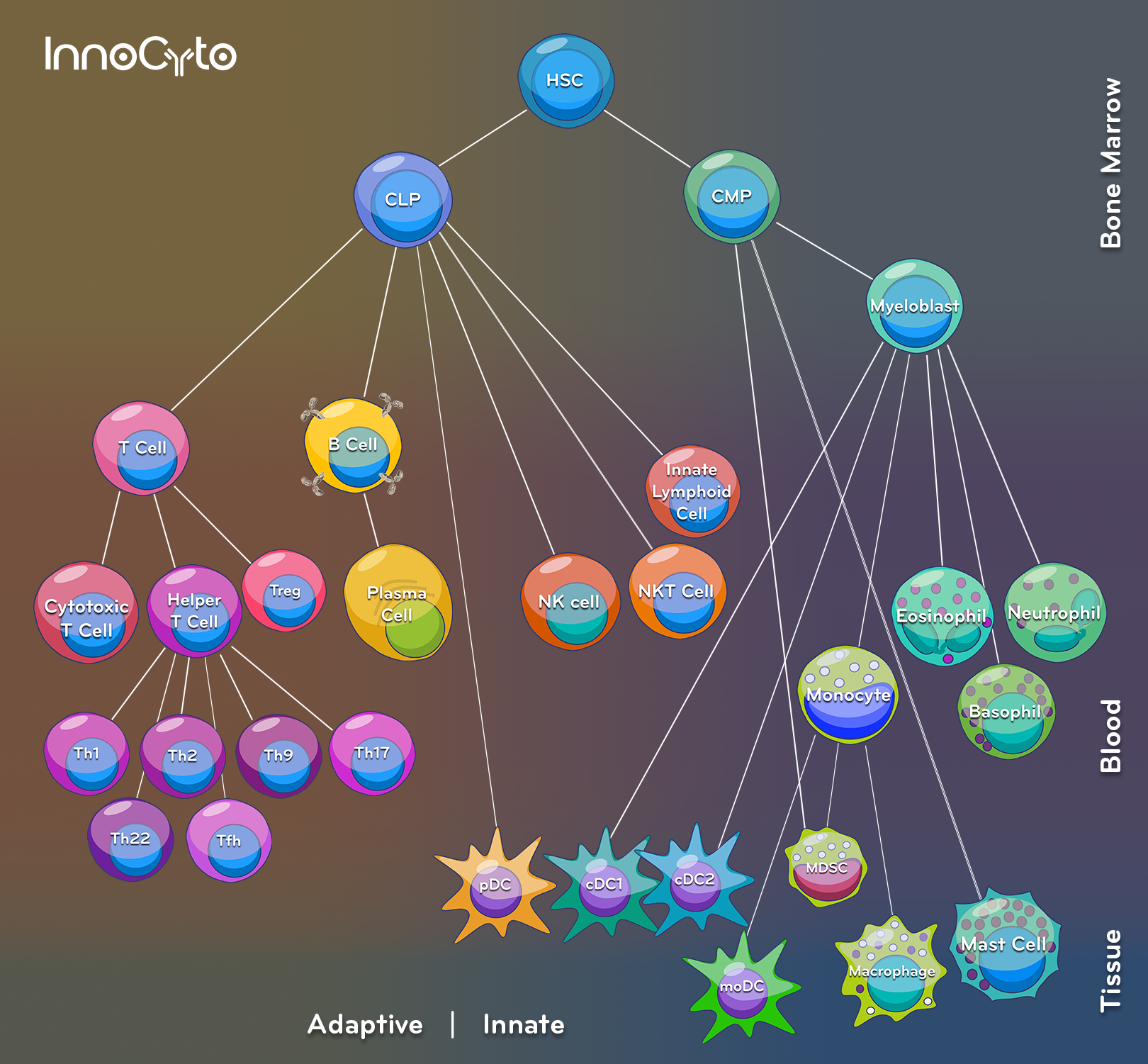 The schematic illustrates the hierarchical differentiation of the hematopoietic system, beginning with hematopoietic stem cells in the bone marrow that bifurcate into common lymphoid and common myeloid progenitors. The common lymphoid progenitor gives rise to adaptive immune populations, including T cells (with further specialization into cytotoxic, helper, regulatory, and multiple effector subsets such as Th1, Th2, Th17, Tfh, etc.) and B cells, which can differentiate into antibody-secreting plasma cells. The common lymphoid progenitor also differentiates into innate-like lymphocytes such as NK, NKT, and innate lymphoid cells. In parallel, the common myeloid progenitor generates innate immune cells through intermediates like the myeloblast, which mature into granulocytes (neutrophils, eosinophils, basophils), conventional dendritic cell subsets, and monocytes, who then further mature into macrophages, dendritic cells, and myeloid-derived suppressor cells. The diagram emphasizes both lineage commitment and functional organization, spatially separating adaptive and innate immunity while also highlighting their developmental interconnections and distribution across bone marrow, blood, and peripheral tissues.