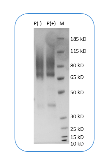 The protein has a predicted molecular weight of 62kDa. Under DTT-reducing conditions, it migrates at approximately 65-100 kDa on SDS-PAGE.