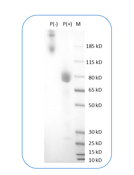 The protein has a predicted molecular weight of 65.7 kDa. Under DTT-reducing conditions, it migrates at approximately 65-80 kDa on SDS-PAGE.