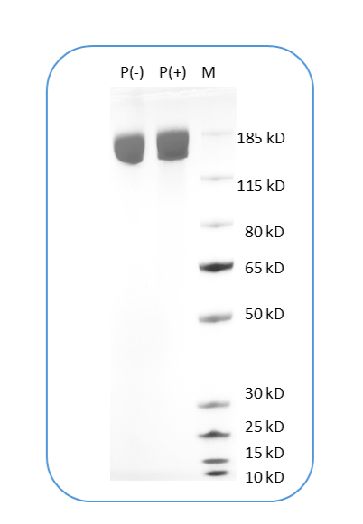 The protein has a predicted molecular weight of 124.7 kDa. Under DTT-reducing conditions, it migrates at approximately 160-200 kDa on SDS-PAGE.