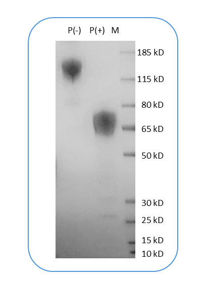 The protein has a predicted molecular weight of 54 kDa. Under DTT-reducing conditions, it migrates at approximately 65-80 kDa on SDS-PAGE.