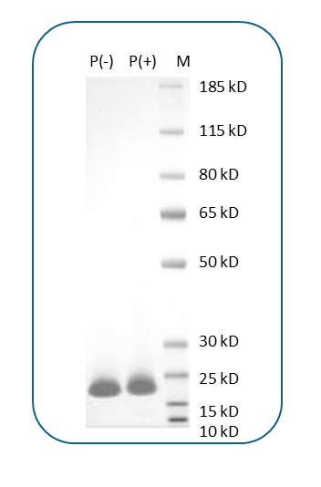 The protein has a predicted molecular weight of 14.2 kDa. Under DTT-reducing conditions, it migrates at approximately 17-20 kDa on SDS-PAGE.