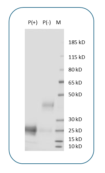 The protein has a predicted molecular weight of 15 kDa. Under DTT-reducing conditions, it migrates at approximately 25 kDa on SDS-PAGE.
