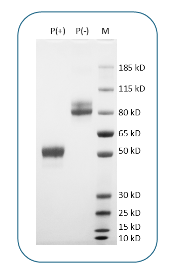 The protein has a predicted molecular weight of 41.9 kDa. Under DTT-reducing conditions, it migrates at approximately 50 kDa on SDS-PAGE.