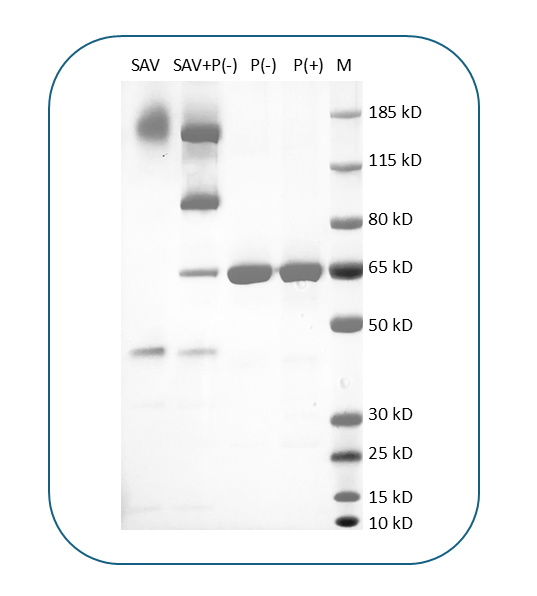 The protein has a predicted molecular weight of 61.3 kDa. Under DTT-reducing conditions, it migrates at approximately 65 kDa on SDS-PAGE.