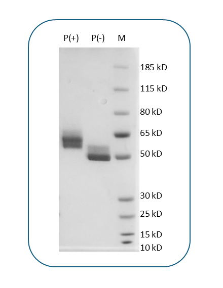 The protein has a predicted molecular weight of 57.7 kDa. Under DTT-reducing conditions, it migrates at approximately 60 kDa on SDS-PAGE.