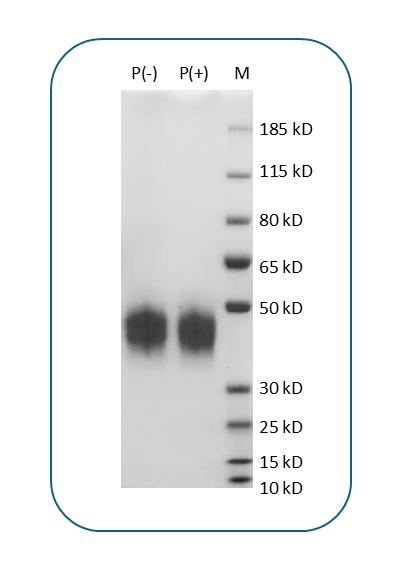 The protein has a predicted molecular weight of 26.1 kDa. Under DTT-reducing conditions, it migrates at approximately 35-45 kDa on SDS-PAGE.