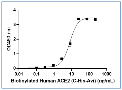 Human ACE2 protein (Gln18-Ser740) with C-terminus His-Avi tag is expressed in CHO cells. This protein was site-specifically labeled with Biotin by BirA ligase.