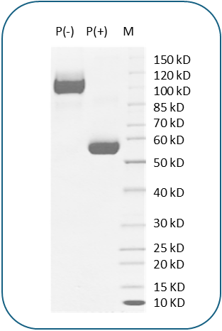 This protein has a predicted molecular weight of 52 kDa. Under DTT-reducing conditions, the protein migrates at approximately 55 kDa on SDS-PAGE.