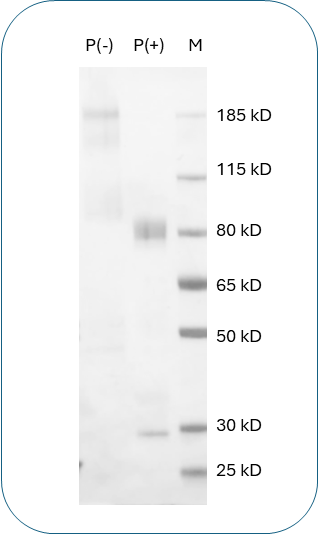 This prtoein has the predicted molecular weight of 79.89 kD. Under DTT-reducing conditions, the protein migrates at approximately 80 kD on SDS-PAGE