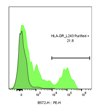 HLA-DR is a heterodimeric cell surface glycoprotein comprised of a 36 kD α (heavy) chain and a 27 kD β (light) chain. It is expressed on B cells, activated T cells, monocytes/macrophages, dendritic cells, and other non-professional APCs. In conjunction with the CD3/TCR complex and CD4 molecules, HLA-DR is critical for efficient peptide presentation to CD4+ T cells.