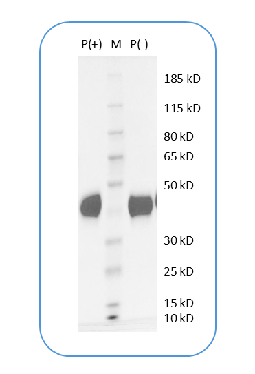The 285 amino acid protein has a predicted molecular weight of 33 kDa. The protein migrates at approximately 35-45 kDa on SDS-PAGE with DTT-reduced conditions.